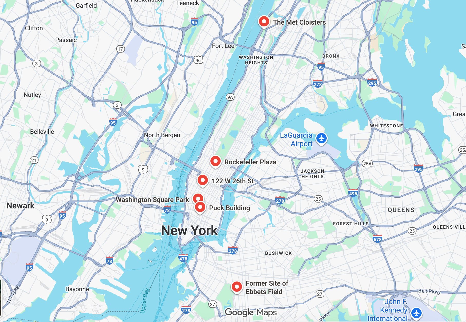 As the map shows, a few of them could reasonably be covered in one day. Site 1: Washington Square Park and Site 6: 30 Rock might the best bang-for-your-buck spots for tourists to check out in general, with this article adding some context. Site 2: The Met Cloisters is the best option for pairing with a museum visit, and Site 3: Ebbets Field is a pilgrimage for sports fans to consider. (I recommend the stretch of Franklin Avenue between Eastern Parkway and Atlantic Avenue for some stellar food options afterward.) For Magic players truly looking to see places of historical interest to the game, I’d stick with Site 4: Neutral Ground and Site 5: Puck Building, both of which have plenty of places to shop and eat nearby. No matter your goals, in assembling these sites, I share some of the stories of cards, games, and especially the trading card game Magic: The Gathering within the city’s boundaries.