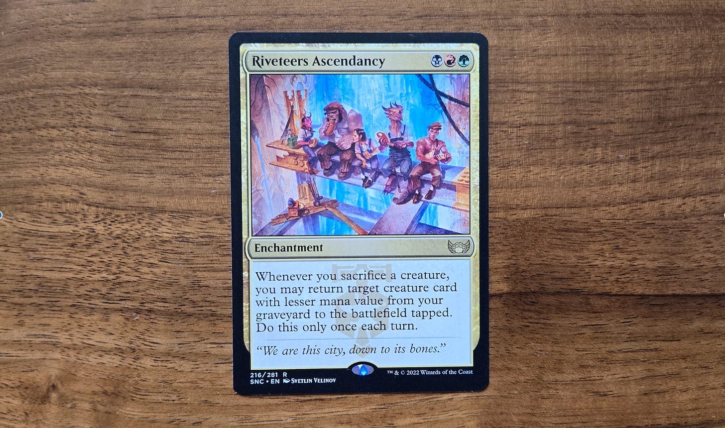 A canonical location being modeled after NYC didn’t truly occur until 2022 with a card set titled Streets of New Capenna, which was designed after urban gangster movies. One card in particular, “Riveteers Ascendancy,” makes an unambiguous city reference. “Back in 1932, a famous black and white photograph was taken that showcased 11 construction workers eating on top of a construction beam high up above New York City,” writes Jerrad Wyche (2022). “Riveteers Ascendency is a multi-color enchantment in Streets of New Capenna that’s practically a one-for-one copy of that iconic photograph. It is likely meant to evoke [pride for blue-collar workers] in the world of MTG.”