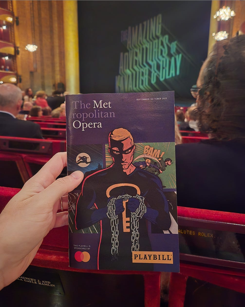 I’m always happy when it’s opera season. This year, Kavalier & Clay was top of mind for me, but there is nary a show I’d say no to.1 One of my favorite things to do is to try and rush the operas. It requires clicking a button at noon (for most performances) on the dot and, even then sometimes getting a little bit lucky. Part of the fun is no doubt the savings. Each ticket is 25 dollars, and I’ve gotten some excellent seats, some amounting to over 90 percent off.