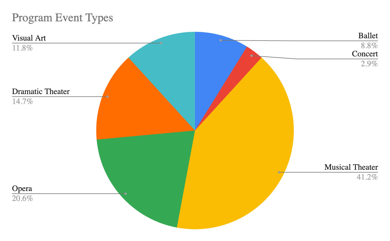 29 of the 34 programs (85%) were for events in Manhattan. Two were in Brooklyn (Arsenic & Old Lace, Legally Blonde), and three were outside NYC (Isabella Stewart Gardner Museum, Storm King Art Center, Chisholm Trail Music Academy Piano Recital).