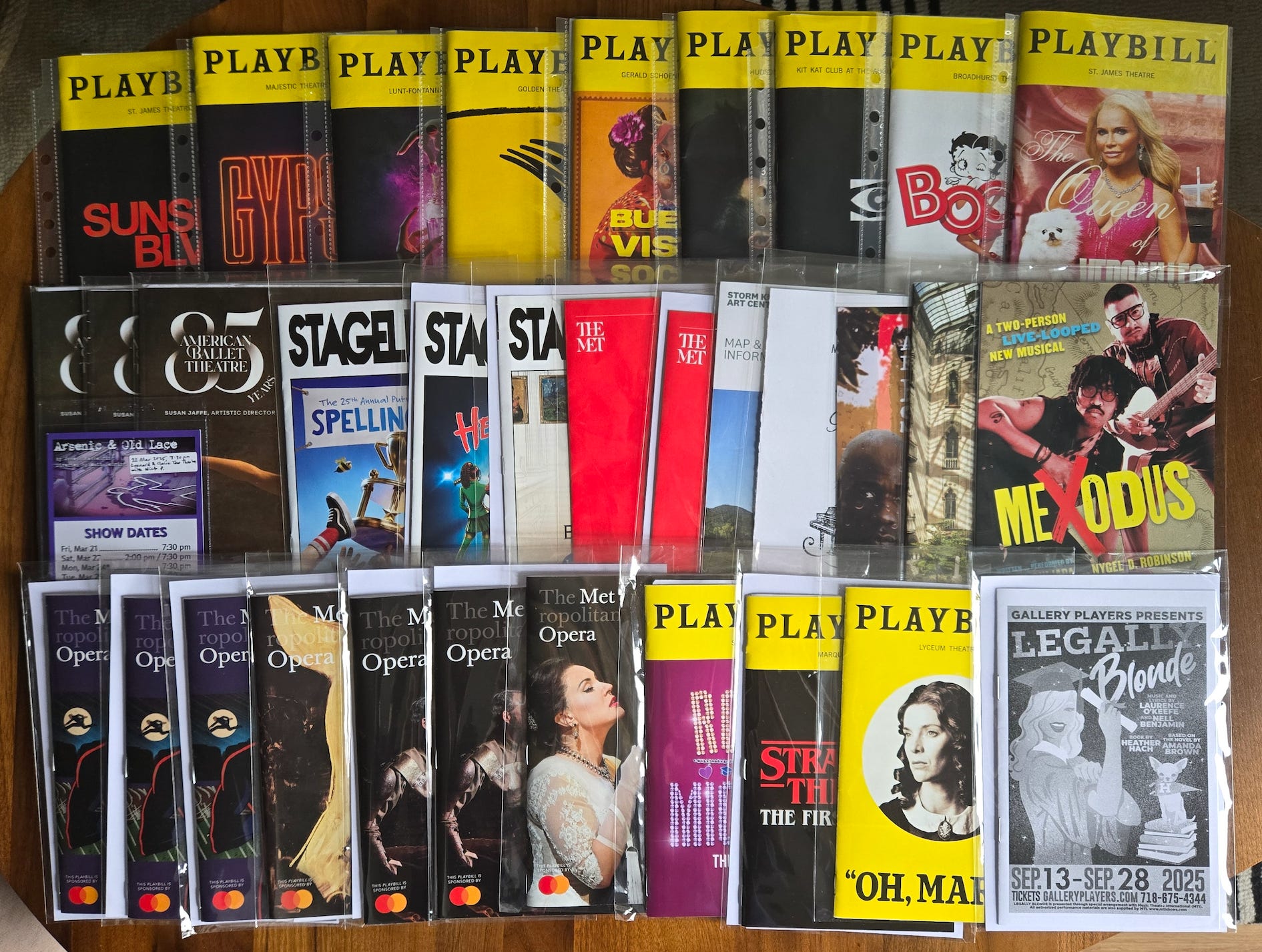 Over time I’ve gotten more careful about actually protecting the programs. The archivist in me believes I’m doing the right thing, although the environmentalist in me wants the archivist to STFU. Programs are encased in sealed plastic sleeves, sometimes kept flat with acid free cardstock, and given a sticker where I write the date, time, people I was with, and sometimes other information. The image at the top of this post shows my 2025 archives. The stickers are usually on the back, but one of them is visible on the small Arsenic & Old Lace program in the second row on the left.