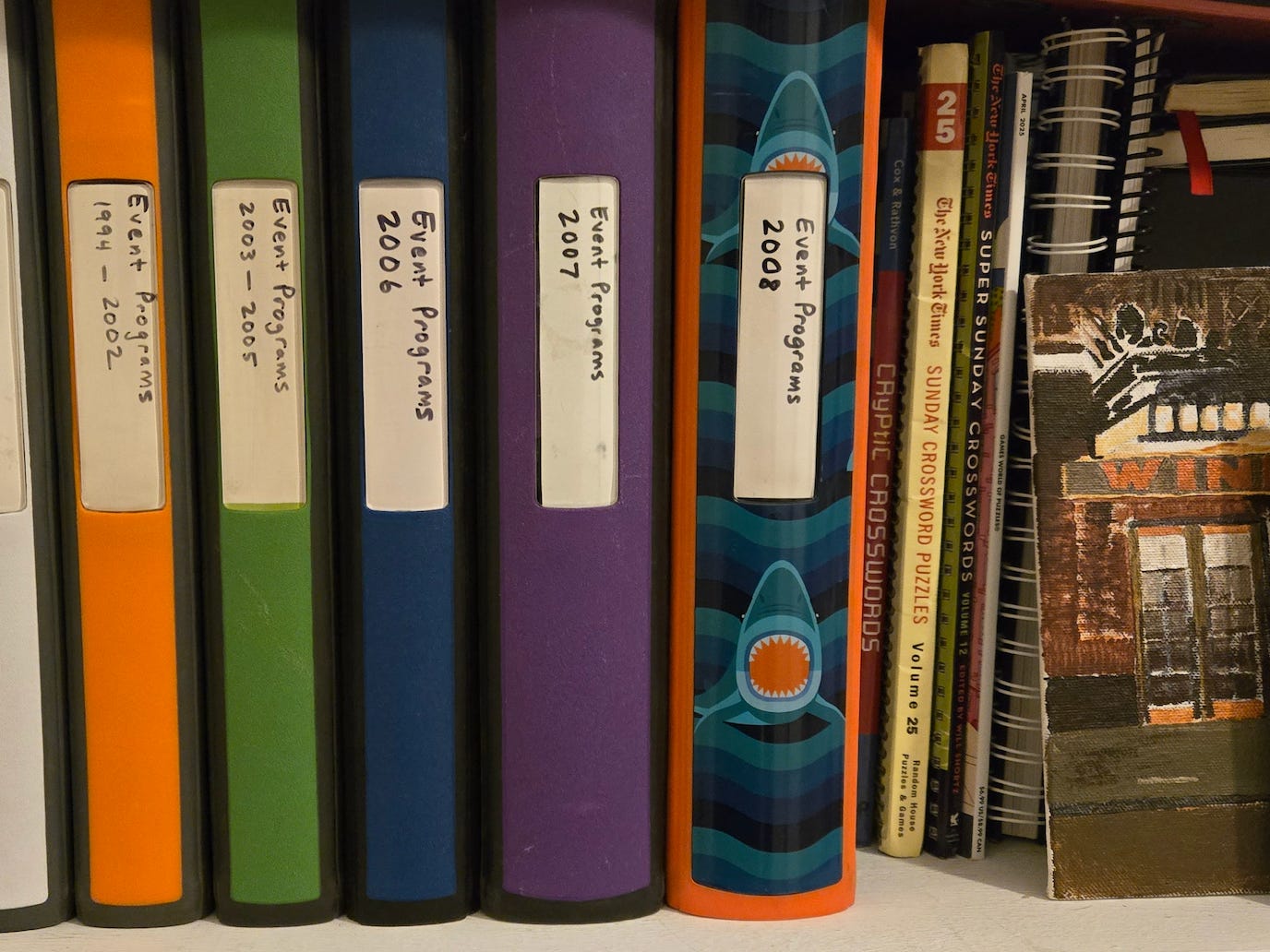 As I get older, this program hoarding can start to look like a life progress bar. I don’t actually need space for a million binders with climate controlled storage units and an itemized database. I need space for, let’s say, 80 binders and we’re doing real good? My 2025 binder is complete. Nothing else will ever get added to it, and the next binder begins.